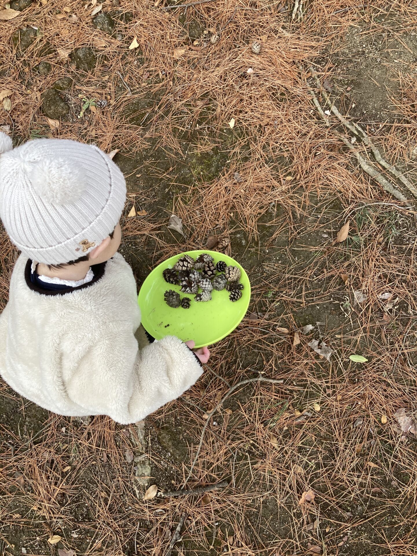 大好きなすべり台そっちのけで松ぼっくりを見つけては[あったー]と叫びひたすら収集。
