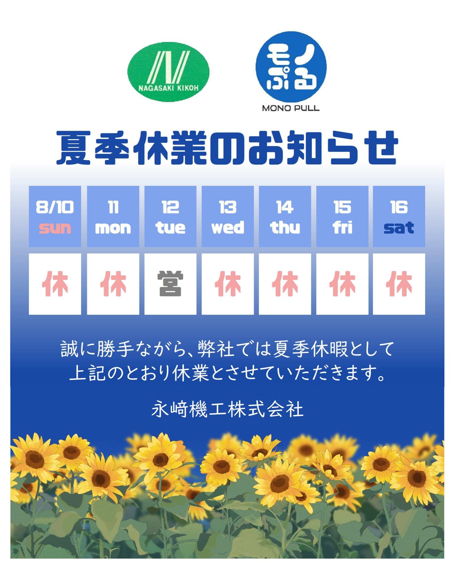 弊社の夏季休業について、以下の通りご案内いたします。