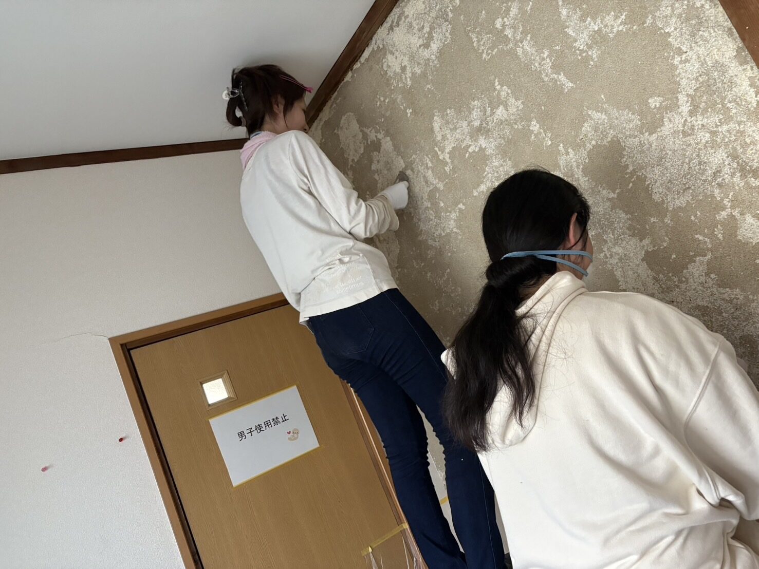 (薄く残った繊維壁を剥がす友人たち)