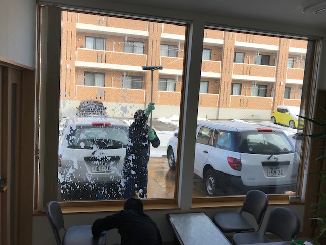 会津営業所も大きなガラス面がありキレイに磨き上げます。