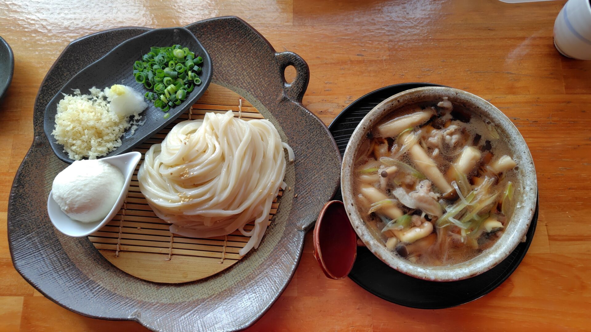 うどんは見かけよりだいぶボリューミーで、つけ汁のきのこ汁はかなり具だくさんでした。