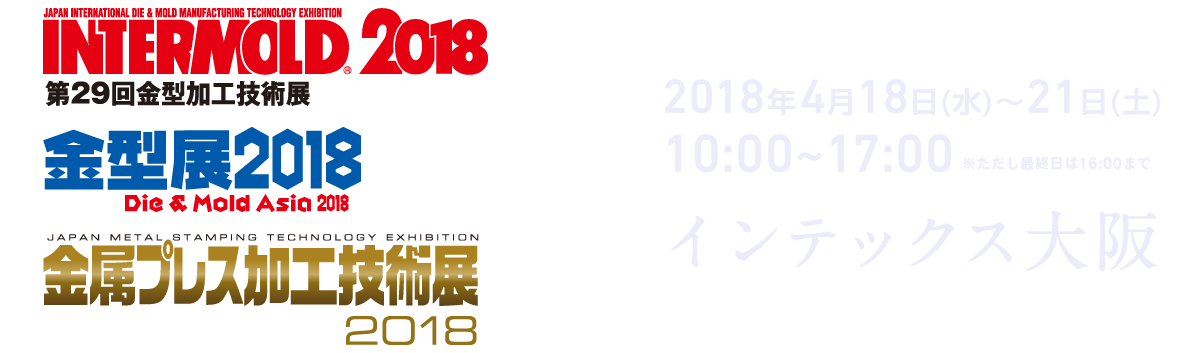 インターモールド振興会では 2018 年 4 月 18 日(水)から 21 日(土)まで 4 日間にわたりインテックス大阪にて開催する「INTERMOLD2018/金型展 2018」(主催:一般社団法人日本金型工業会/テレビ大阪)ならびに「金属プレス加工技術展 2018」(主催:一般社団法人日本金属プレス工業協会)を開催いたします。