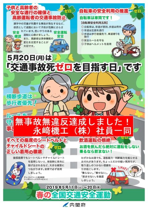 春の交通安全運動終了 2019年5月21日 おはようございます。 全社を挙げて取り組んだ春の交通安全運動が終了しました。 無事故無違反で期間を終了しました! 期間は終了しましたが、引き続き安全第一を励行します。 横断歩道は歩行者優先! ルールを守って安全運転! お役立ち企業を目指して!