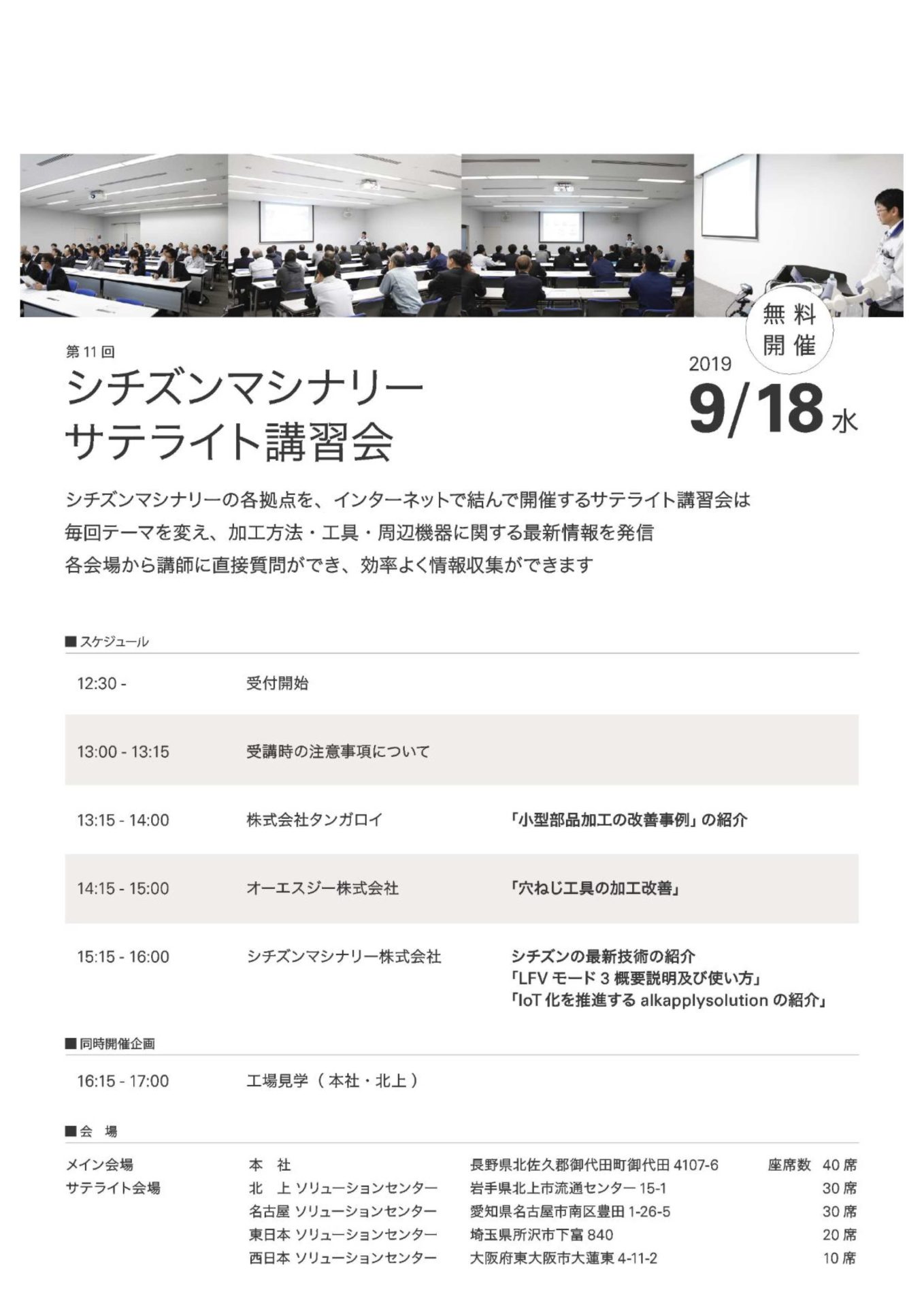☆彡イチ押し 第11回シチズンマシナリーサテライト講習会 2019年8月28日 おはようございます。 第11回シチズンマシナリーサテライト講習会が北上ソリューションセンターなどを結んで開催予定! インターネット回線を結んでの各拠点同時開催です。 北上では工場見学も予定されています。 お役立ち企業を目指して!