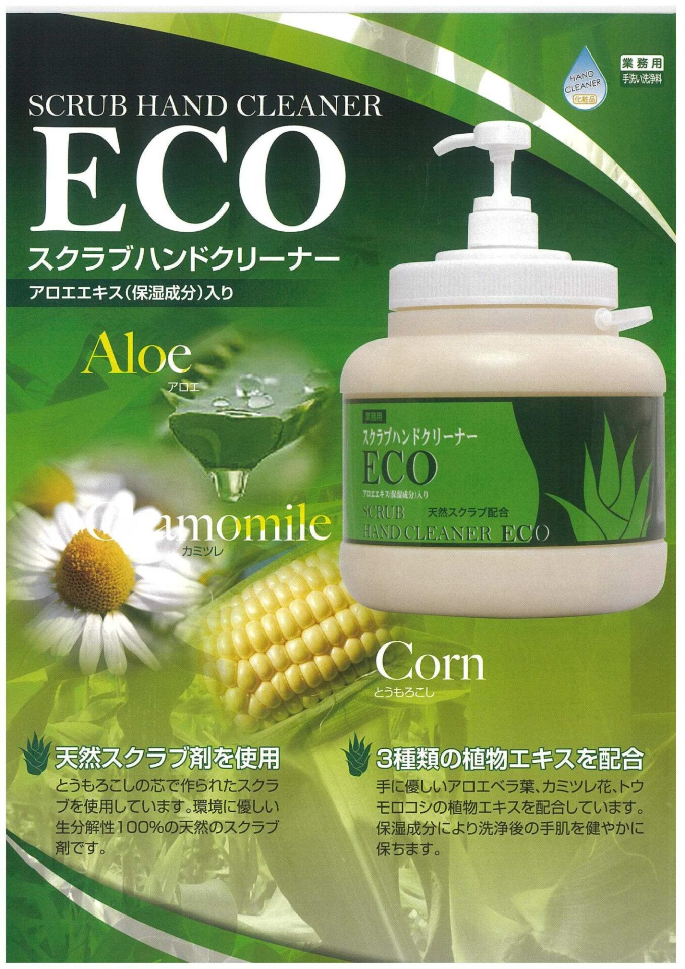 また、三種類の植物エキス(アロエ、カミツレ、トウモロコシ)を配合している為、洗浄後の手肌を健やかに保ちます!