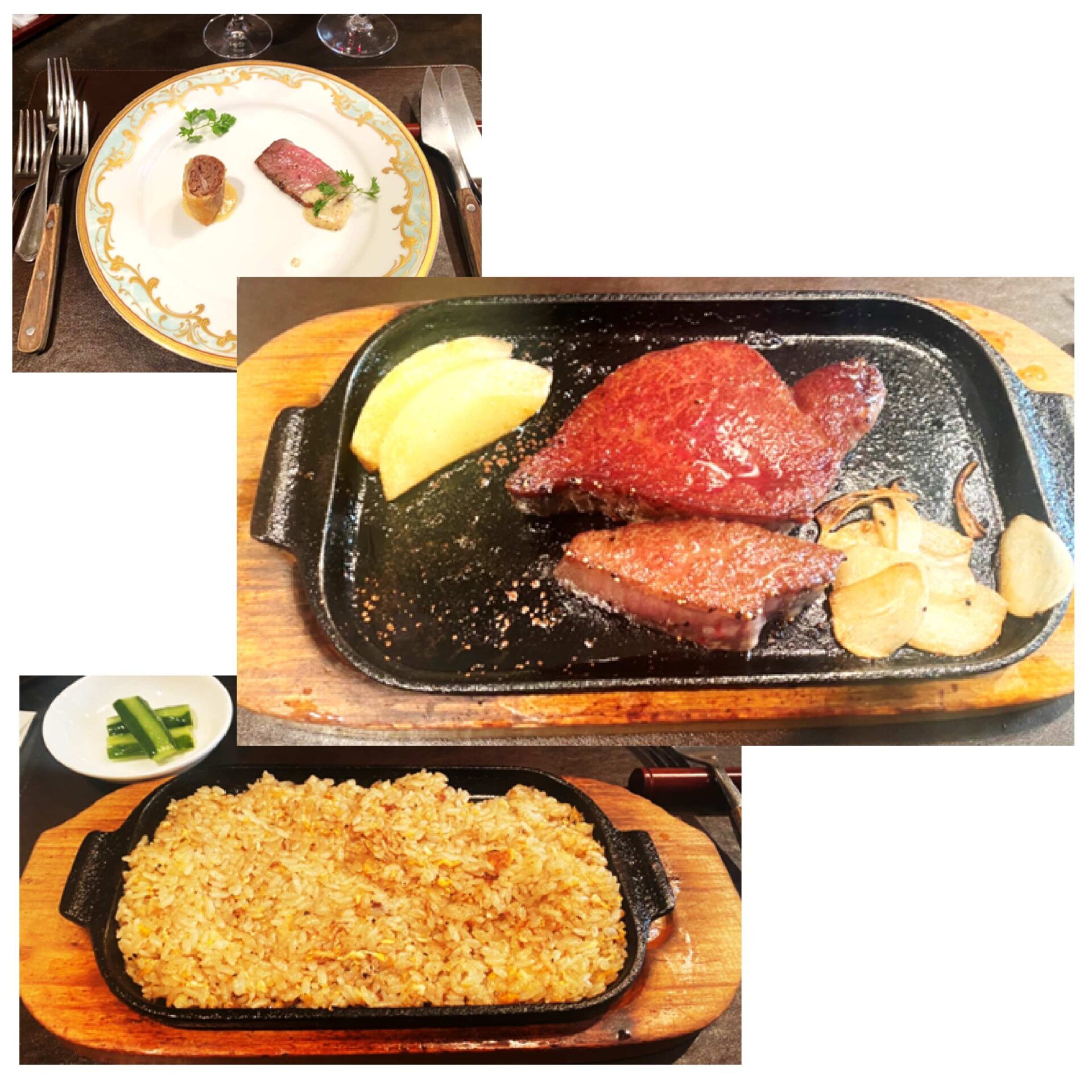 (写真は前菜の春巻き・ローストビーフ、ステーキ、焼き飯)