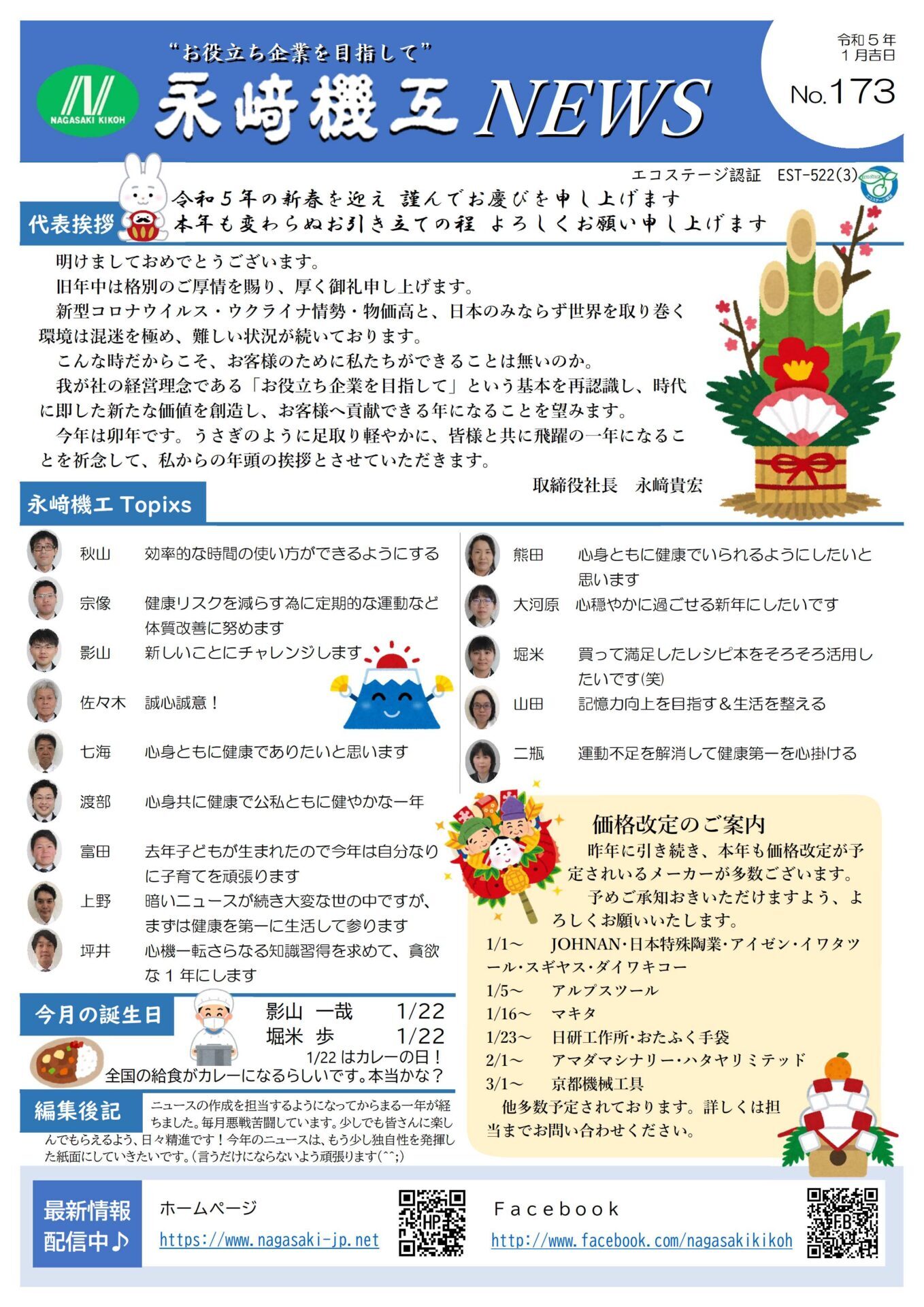 我が社の経営理念である「お役立ち企業を目指して」という基本を再認識し、時代に即した新たな価値を創造し、お客様へ貢献できる年になることを望みます。