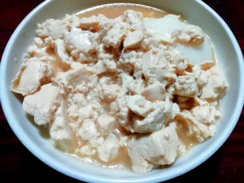 温めた餅の上に、軽く炒めた豆腐をかけて醤油で味付けただけのシンプルな食べ方ですが、あっさりとしていて飲み込みやすい食感なので いくらでも食べる事ができます。
