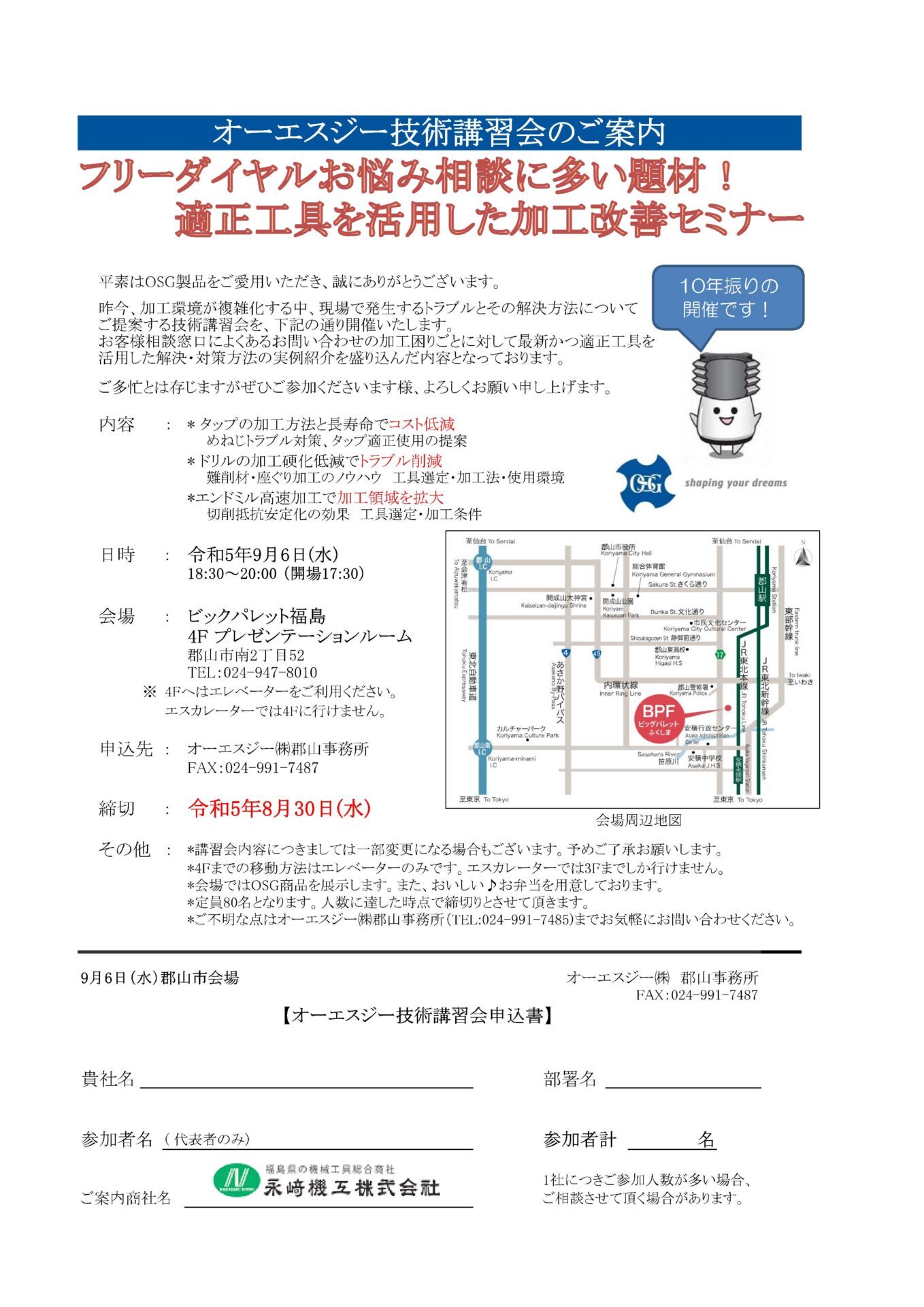 講習参加の申し込み締め切り日は令和5年8月29日まで、 申し込み先は弊社営業担当 もしくはオーエスジー郡山事務所となっております。