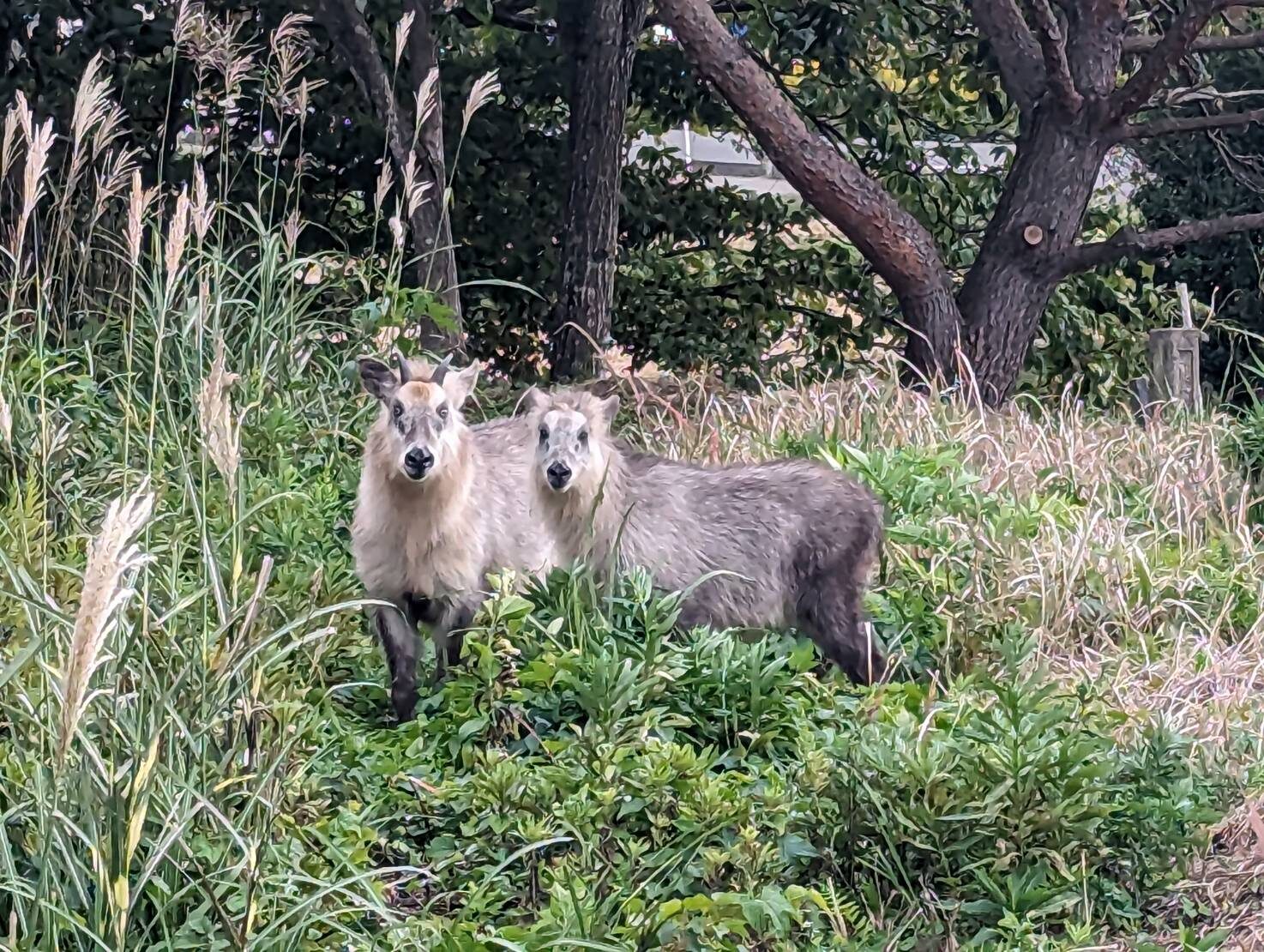先日もお客様のところに訪問した際、ふと駐車場の向こうを見たらニホンカモシカのつがいが隣の畑でお食事中でした。