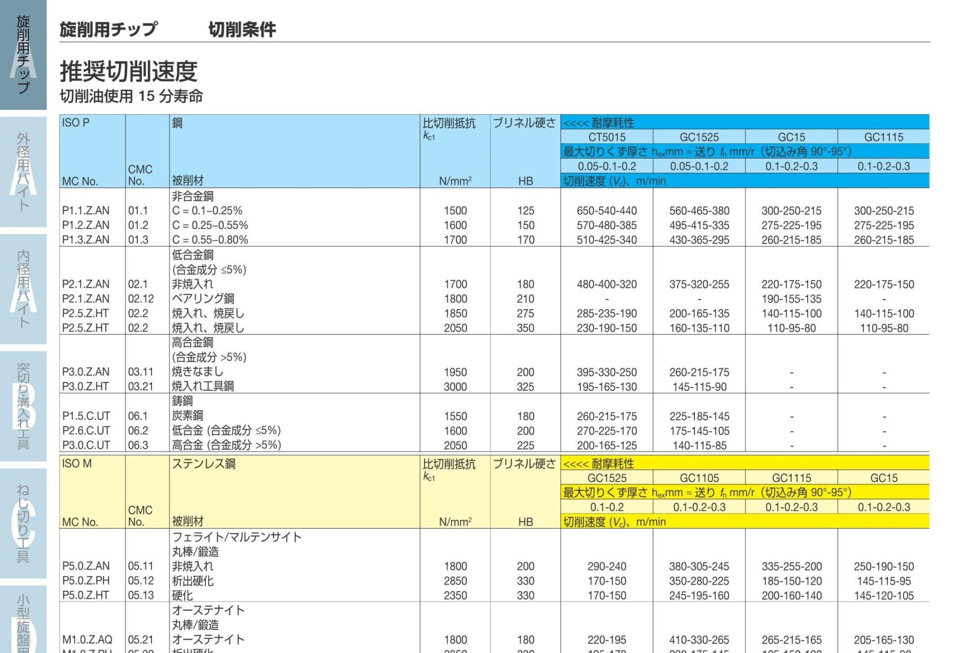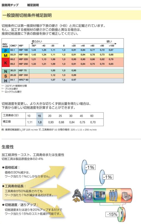 工具メーカーカタログにある切削条件表は15分寿命で載っています。