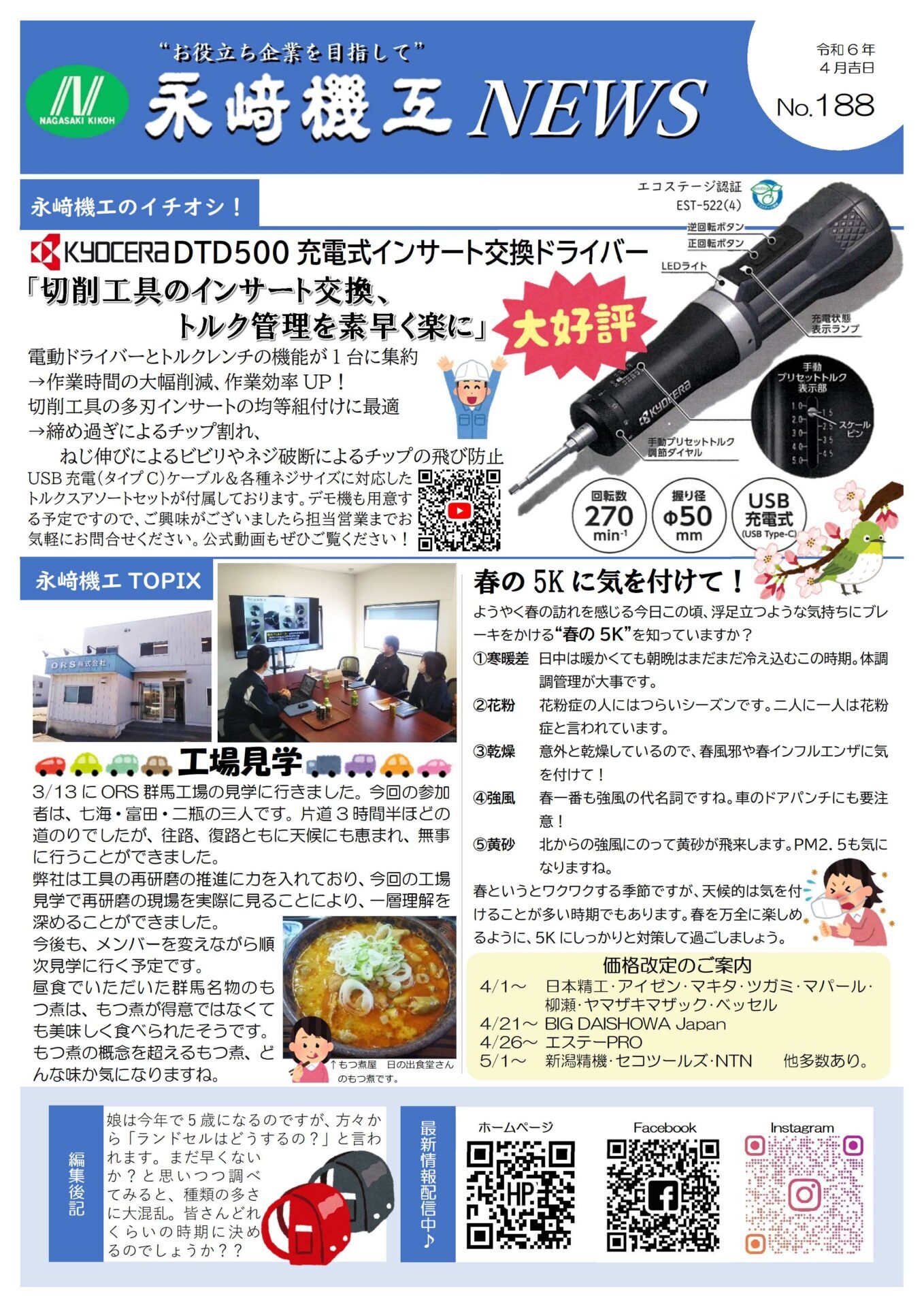 永﨑機工ニュースNo.188が完成いたしました。