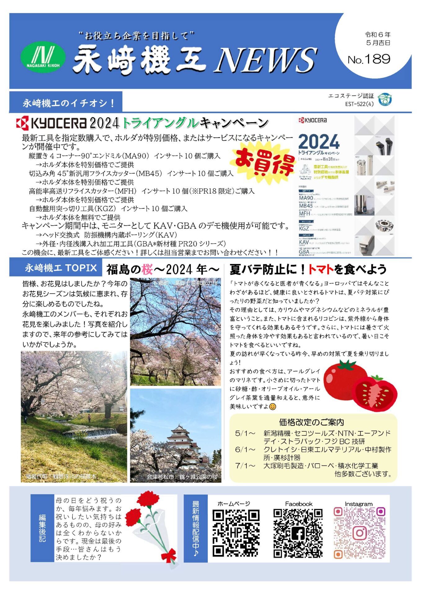 永﨑機工ニュースNo.189が完成いたしました。