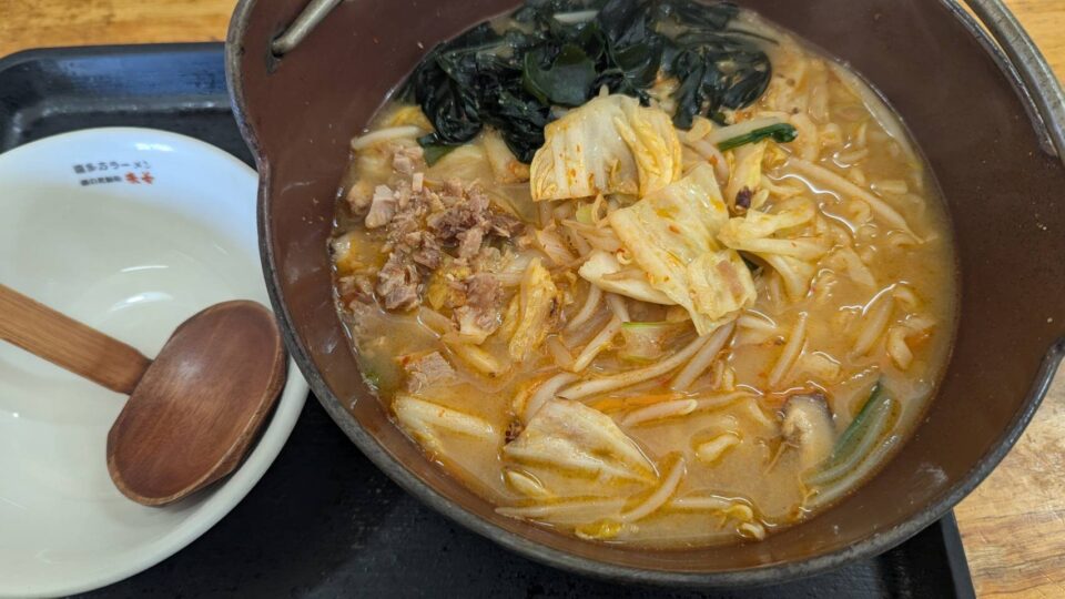 鍋焼きラーメンは冬になると始まる限定メニューで、寒い冬にピッタリな熱々ちょい辛で野菜たっぷりな鉄鍋で提供されるラーメンです。