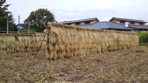 はざかけ」とは、刈り取った稲を逆さにして天日乾燥させることをいいます。 稲刈り直後の籾(玄米)はそのままでは水分が多過ぎるので、乾燥させる必要があります。水分が多過ぎると、保存中に味、風味が悪くなり、ひどいときにはカビが生えたりします。天日干しとは、刈った稲を穂がついたまま写真のように太陽の光と風で乾燥することをいいます。天日干しは一般的に甘み・旨味が増すといわれています。 (Googleさん参照)