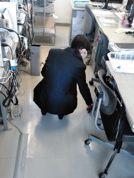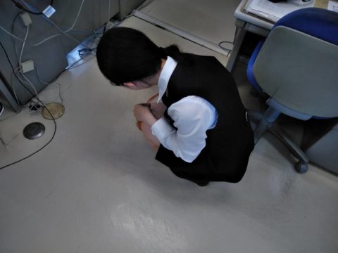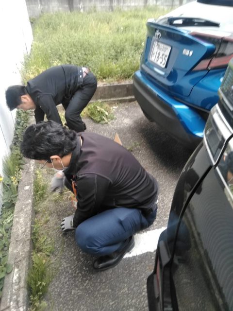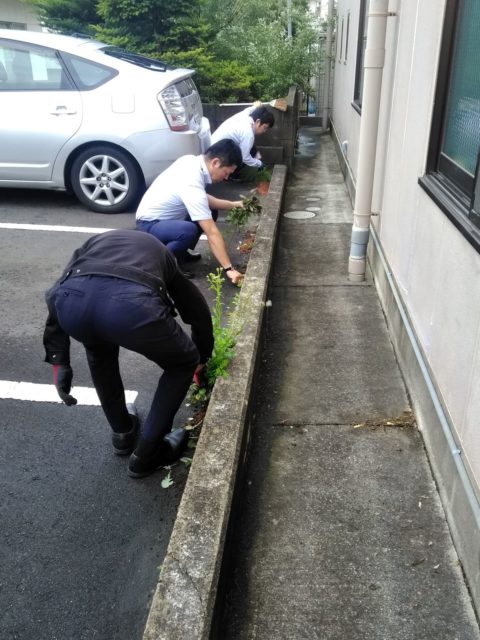 少し離れたところにある、社員駐車場の草取りや社内の床磨きを行いました。