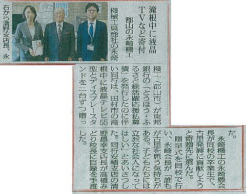 「誰もが古里を思う気持ちがある。子供たちには立派な社会人になってほしい」と挨拶し東邦銀行安積支店の清野昌幸支店長様立会いのもと母校の滝根中学校の高橋みどり校長へ目録を手渡しました。