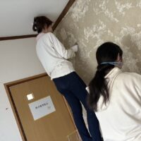 (薄く残った繊維壁を剥がす友人たち)