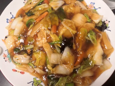 五目焼きそばは具沢山で野菜が多く摂取出来るのと、麺の一部にお焦げがあって風味が豊かなところが好きです。 あんかけなので腹持ちが良いのもいいですね。 この後のビールタイムもずっと満腹が持続するのでツマミも不要です。