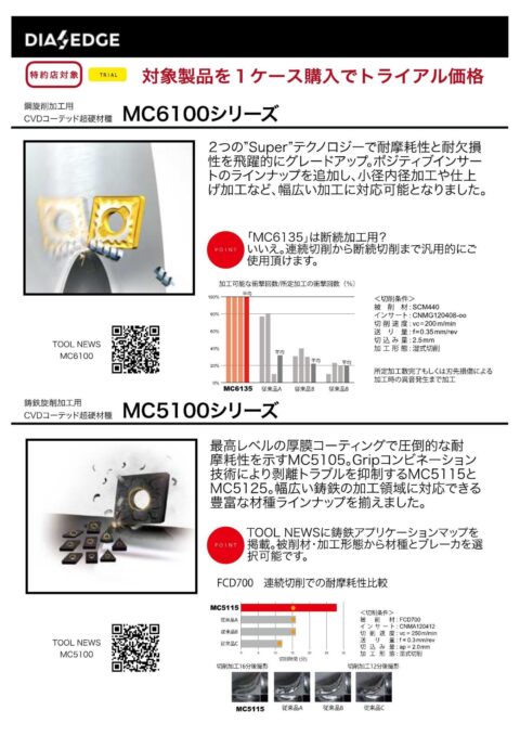 ①鋼旋削加工用CVDコーテッド超硬材種MC6100シリーズ