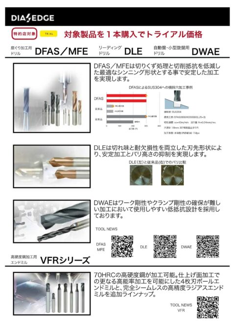 ⑤座ぐり加工用ドリルDFAS/MFE、リーディングドリルDLE、自動盤・小型旋削用ドリルDWAE