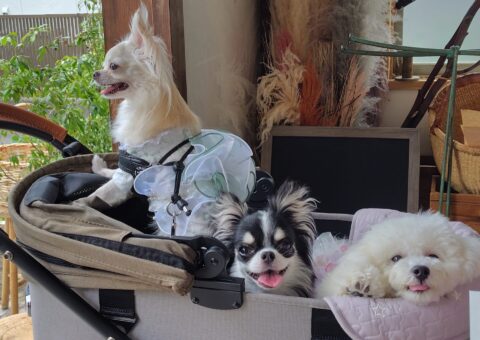上の写真は先日犬たちをバギーに乗せてお出かけした時の1枚です。