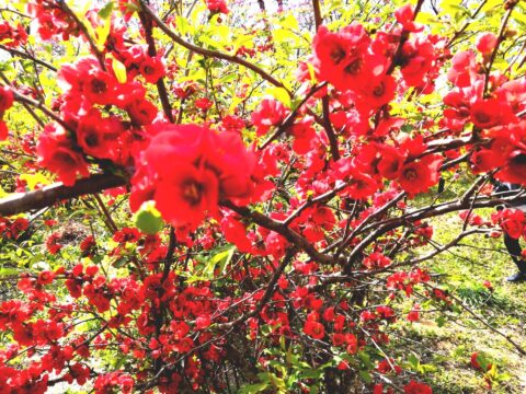 これは皆さん知らないかも? これが「ボケ」の花なんです。 鮮やかな赤い花びらがとても美しいです。 個人的には春の花の中で№1に綺麗だと思います。