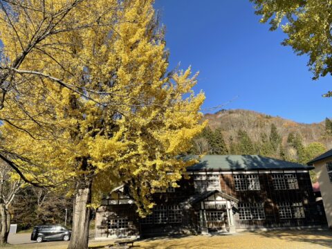 今月お天気の良い時に、ちょうど見ごろの 昭和村 喰丸小のオオイチョウの木を見てきました。