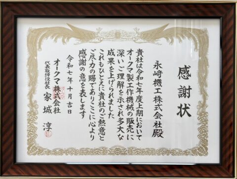 先日オークマ株式会社の担当者の方が来社され、感謝状を頂戴いたしました。