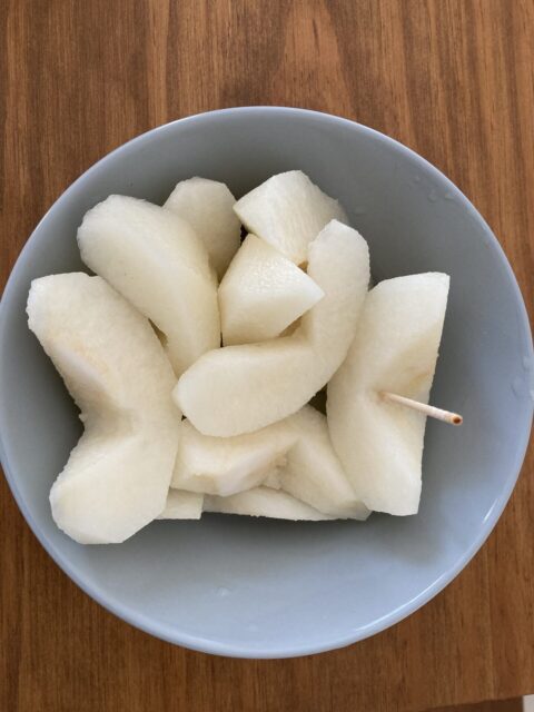梨のコンポートは全て娘の胃に納まりましたが、シャインマスカットのゼリー寄せが美味しかった!