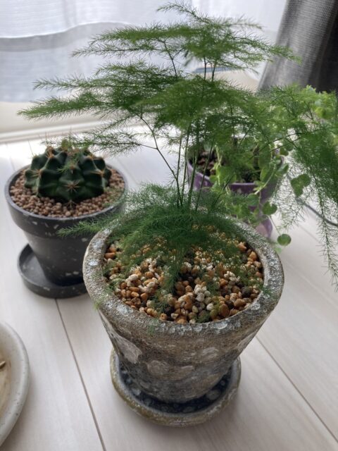 アスパラガスという観葉植物です。お店でフサフサと佇むのを見て即決で買うのを決め名前を「アス」と付けました。