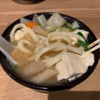 ゴロゴロと大きめカットの根菜、ねぎ、豆腐とそれに負けない極太でこしのつよい